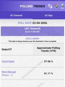 Bengal-TN Voting Update : पश्चिम बंगाल और तमिलनाडु में आज विधानसभा चुनाव की वोटिंग चल रही है। सुबह 11 बजे तक पश्चिम बंगाल में 41.11 प्रतिशत और तमिलनाडु में 37.56 प्रतिशत मतदान हो चुका है। मुर्शिदाबाद में पथराव-लाठीचार्ज की जानकारी सामने आ रही है।