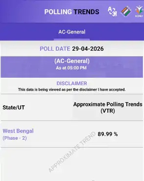 Bengal Voting Percentage : कोलकाता। पश्चिम बंगाल विधानसभा चुनाव के दूसरे चरण में बुधवार को 142 सीटों पर मतदान के दौरान जबरदस्त उत्साह देखने को मिला। दोपहर 3 बजे तक जहां 78.68% मतदान हुआ था, वहीं शाम 5 बजे तक यह आंकड़ा बढ़कर 89.99% पहुंच गया। भारी संख्या में मतदाता बूथों पर पहुंचे और कई जगह लंबी कतारें नजर आईं।