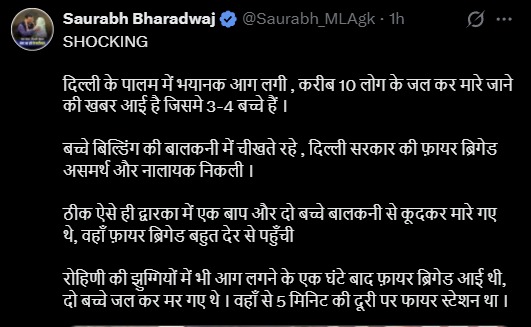इस घटना पर सौरभ भारद्वाज ने कड़ी प्रतिक्रिया दी है। उन्होंने सोशल मीडिया पर पोस्ट कर दावा किया कि इस हादसे में करीब 10 लोगों की जलकर मौत हो गई है, जिनमें 3-4 बच्चे भी शामिल हैं। उन्होंने फायर ब्रिगेड की कार्यप्रणाली पर सवाल उठाते हुए इसे लापरवाही करार दिया।