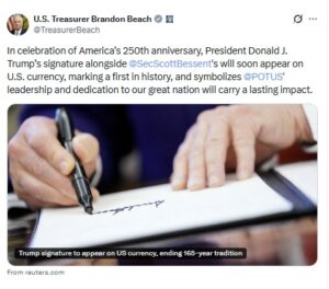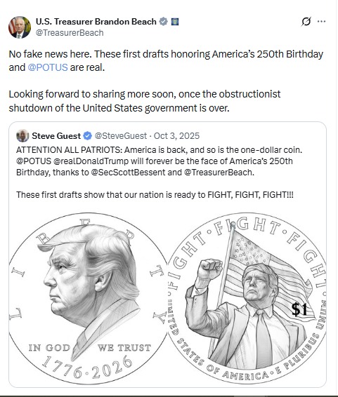 अमेरिकी ट्रेजरी विभाग और ट्रेजरर ब्रैंडन बीच (Brandon Beach) ने इस फैसले की पुष्टि की है। वहीं, ट्रेजरी सचिव स्कॉट बेसेंट (Scott Bessent) ने कहा कि यह कदम देश की आर्थिक मजबूती और ट्रंप की लीडरशिप को सम्मान देने के लिए उठाया गया है।
