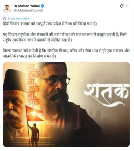 Film Shatak Tax Free in MP : भोपाल। मध्य प्रदेश सरकार ने राष्ट्रीय स्वयंसेवक संघ के 100 वर्षों के सफर पर बनी हिंदी फिल्म ‘शतक’ को राज्य में टैक्स फ्री करने का फैसला लिया है।