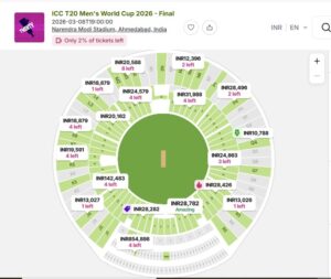 फाइनल मैच के टिकट आधिकारिक तौर पर BookMyShow और आईसीसी के आधिकारिक पोर्टल के जरिए बेचे जा रहे हैं। टिकटों की भारी मांग के चलते ज्यादातर कैटेगरी फिलहाल “सोल्ड आउट” हो चुकी हैं।