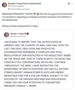 अमेरिकी राष्ट्रपति डोनाल्ड ट्रंप (Donald Trump) ने अपने सोशल मीडिया प्लेटफॉर्म ‘ट्रुथ सोशल’ पर एक पोस्ट में कहा कि अमेरिका और ईरान के बीच “बहुत अच्छी और उत्पादक बातचीत” हुई है। उन्होंने बताया कि इन बातचीत के सकारात्मक संकेतों को देखते हुए ईरान के पावर प्लांट और ऊर्जा ढांचे पर होने वाले सभी सैन्य हमलों को 5 दिनों के लिए रोक दिया गया है। यह फैसला आगे की बातचीत की सफलता पर निर्भर करेगा।