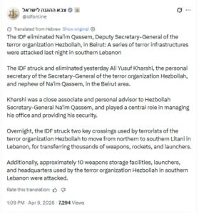 इजरायली सेना ने यह भी बताया कि हमले में कासिम के करीबी सहयोगी और निजी सचिव अली यूसुफ खरशी भी मारे गए हैं। खरशी, नईम कासिम के भतीजे थे और संगठन के अंदर सुरक्षा और प्रशासनिक कार्यों में उनकी महत्वपूर्ण भूमिका थी।