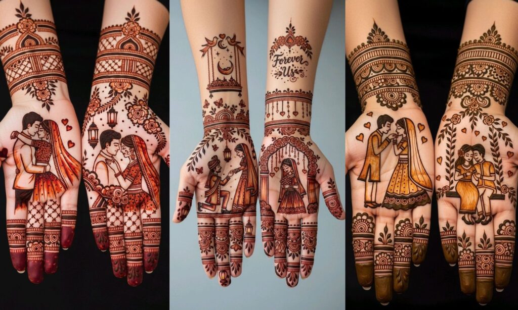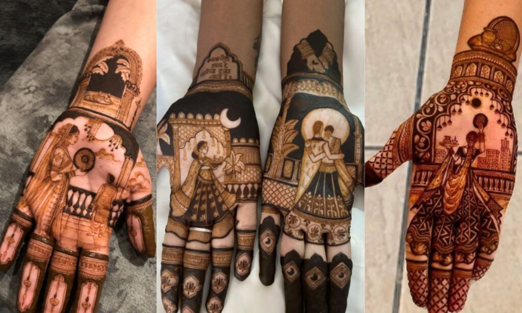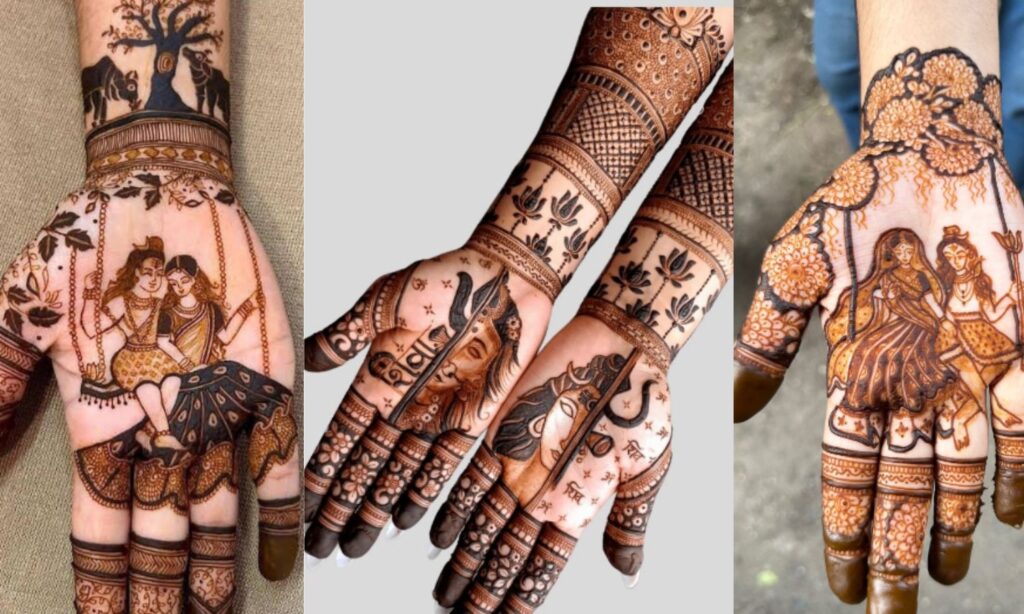अगर आप अध्यात्म से जुड़ी हैं और अपने मेहंदी डिजाइन में कुछ अलग चाहती हैं, तो ये डिजाइन एकदम परफेक्ट है। इसमें एक हथेली पर भगवान शिव और पार्वती माता की आकृति बनाई जाती है, जो उनके अटूट प्रेम को दर्शाती है।