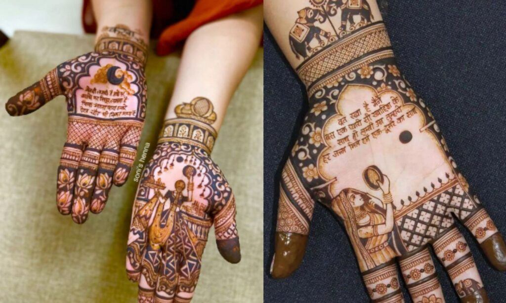 अगर आप कुछ सिंपल पर यूनिक चाहती हैं, तो ये डिजाइन ट्राय कर सकती हैं। इसमें हथेली पर पूजा करती महिला की आकृति बनी होती है। इस डिजाइन को और पर्सनल टच देने के लिए आप इसमें अपने पति का नाम छिपाकर लिखवा सकती हैं। ये डिजाइन बहुत ही ट्रेडिशनल।