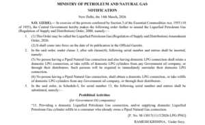 LPG Cylinder Crisis : नई दिल्ली। मिडिल ईस्ट में बढ़ते तनाव और ऊर्जा आपूर्ति पर पड़े असर के बीच भारत सरकार ने घरेलू गैस कनेक्शन को लेकर बड़ा फैसला लिया है। मिनिस्ट्री ऑफ पेट्रोलियम एंड नेचुरल गैस ने आदेश जारी करते हुए कहा है कि जिन घरों में पाइप्ड नेचुरल गैस (PNG) कनेक्शन उपलब्ध है, वे अब लिक्विफाइड पेट्रोलियम गैस (LPG) का घरेलू कनेक्शन नहीं रख सकेंगे।