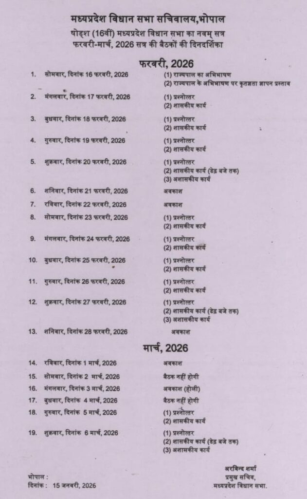 • मध्य प्रदेश विधानसभा का बजट सत्र 16 फरवरी से 6 मार्च 2026 तक 19 दिन चलेगा, कुल 12 बैठकें होंगी।