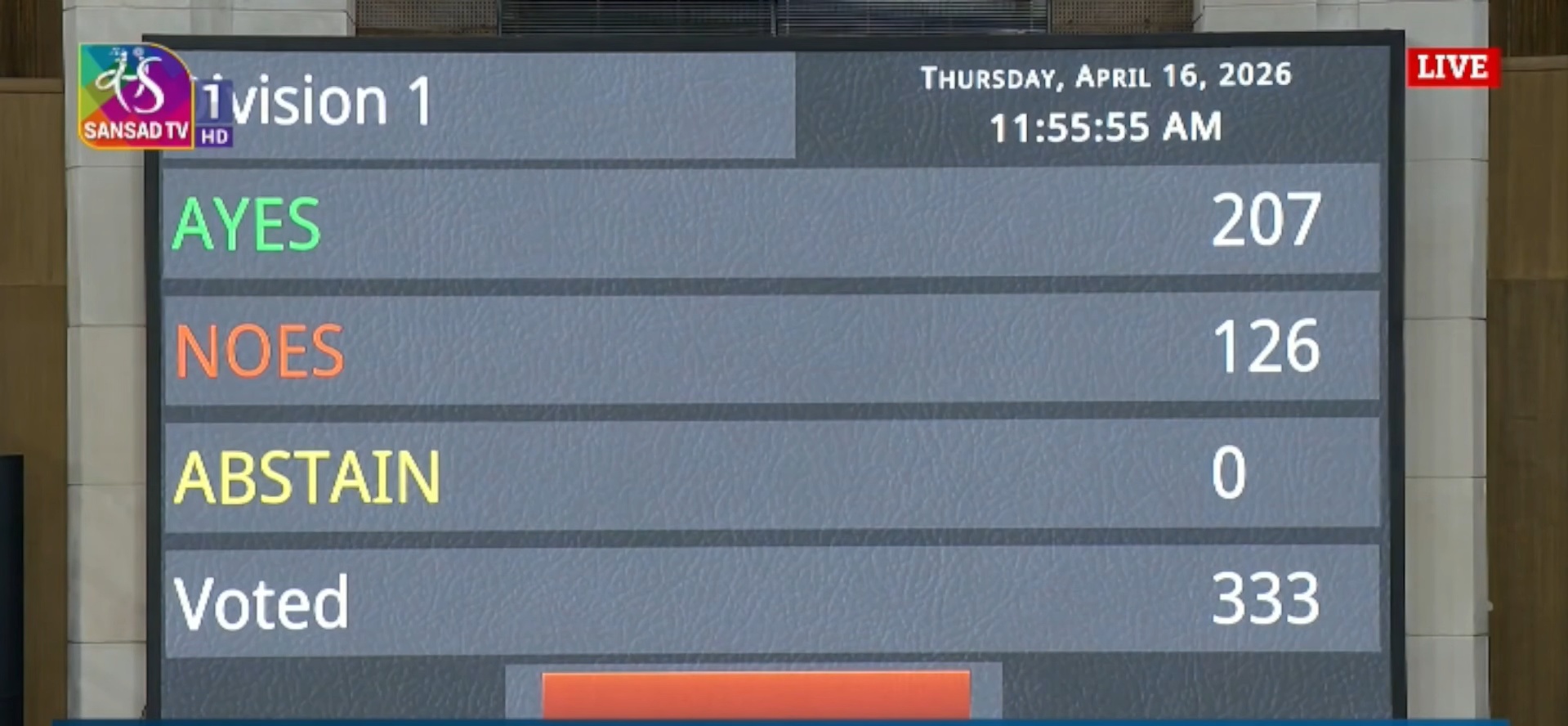 लोकसभा में संविधान (131वां संशोधन) विधेयक पेश कर दिया गया है. विधेयक को पेश करने के दौरान हुई वोटिंग में 207 सांसदों ने बिल के पक्ष में मतदान किया, जबकि 126 सांसदों ने इसका विरोध किया। बहुमत मिलने के साथ ही सरकार विधेयक को सदन में पेश कराने में सफल रही। अब आगे इस पर विस्तृत चर्चा और पारित कराने की प्रक्रिया होगी।