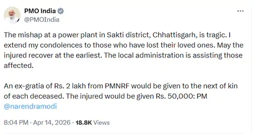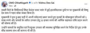 इसके अलावा , मुख्यमंत्री विष्णुदेव साय ने भी दुख जताते हुए मृतकों के परिजनों को 5-5 लाख रुपए और घायलों को 50 हजार रुपए देने का ऐलान किया है।